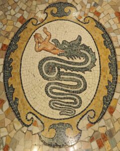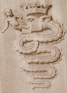Un serpente coronato che inghiotte, o forse genera, una figura umana. Un’immagine potente, quasi inquietante, ma profondamente legata all’identità della città.